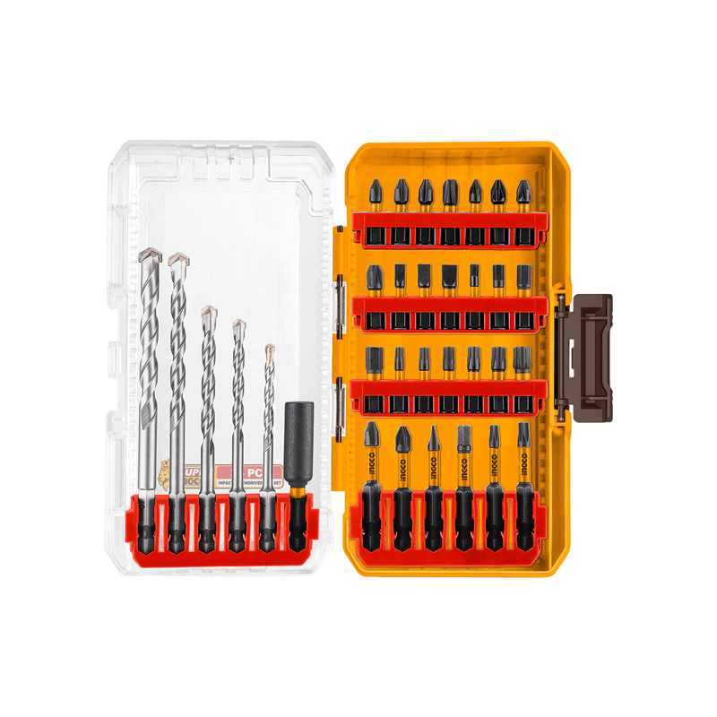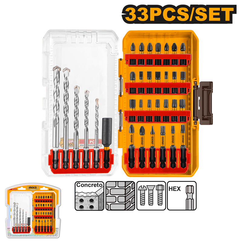 O Conjunto de Brocas para Alvenaria e Bits INGCO 33 Peças foi desenvolvido para oferecer praticidade e variedade em trabalhos de perfuração e fixação com ferramentas compatíveis.