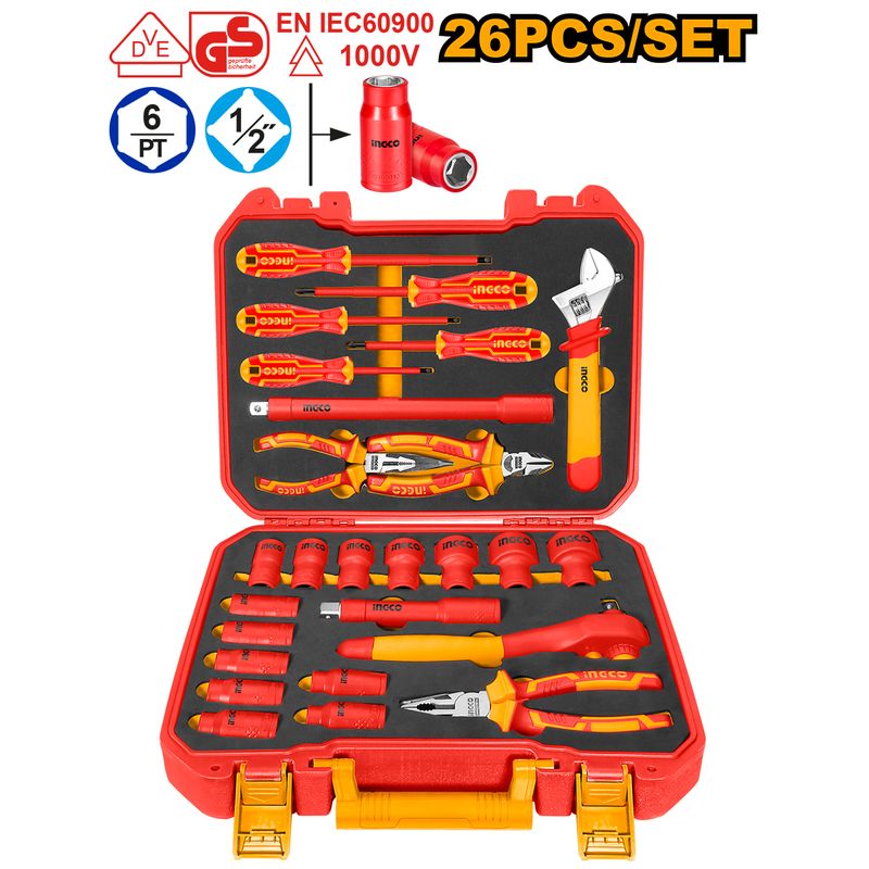 O Conjunto de Ferramentas Isoladas INGCO 1000V VDE com 26 peças foi desenvolvido para trabalhos elétricos profissionais com total segurança. Todas as ferramentas possuem isolamento para até 1000V e contam com certificação VDE/GS, garantindo confiabilidade, durabilidade e proteção contra choques elétricos.