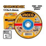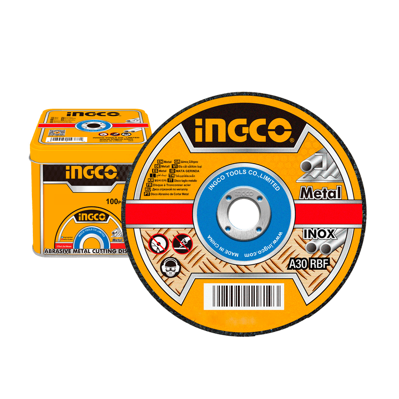 O Jogo de Discos de Corte para Metal INGCO é essencial para cortes rápidos e precisos em metal e inox. Cada disco possui diâmetro de 115 mm (4.1/2""), espessura de 1,0 mm (3/64"") e furo de 22,2 mm (7/8""), com centro plano para maior estabilidade e controle durante o corte. Embalado em uma caixa de metal resistente, o kit com 100 unidades oferece fácil transporte e armazenamento seguro, ideal para profissionais que buscam desempenho, durabilidade e organização no dia a dia.
