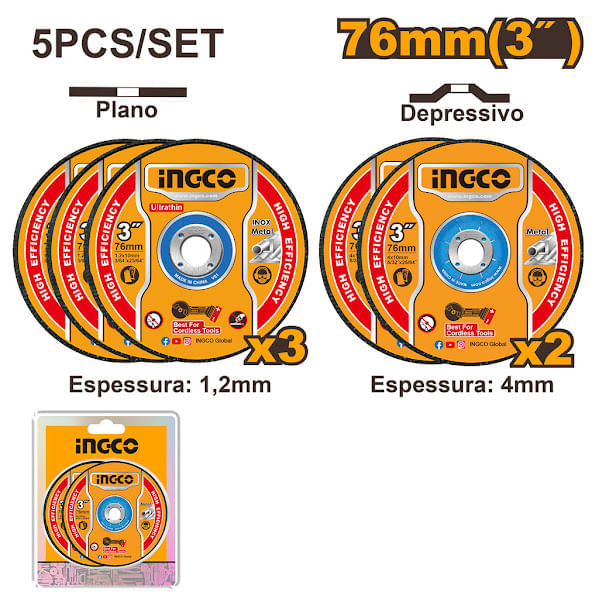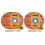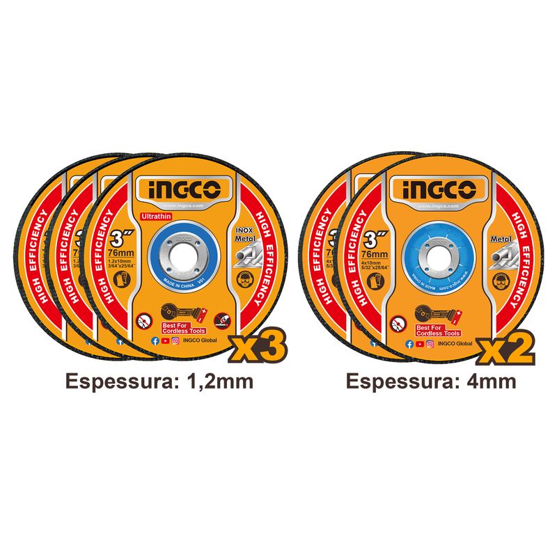 Precisão e resistência para cortes impecáveis! O Jogo de Discos de Corte e Desbaste para Metal INGCO é essencial para quem busca eficiência e durabilidade. Com 5 peças no kit, inclui 3 discos finos (1,2mm) para cortes rápidos e precisos, além de 2 discos mais robustos (4,0mm) para desbastes eficazes. Compatível com diversos modelos de mini esmerilhadeiras INGCO, é a escolha certa para trabalhos exigentes. Embalado em blister duplo para máxima proteção!