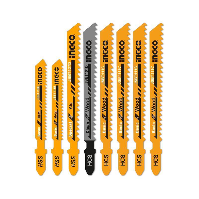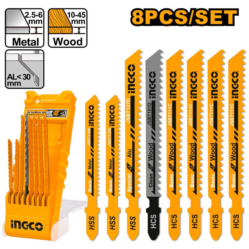 O Jogo de Lâminas de Serra INGCO com 8 peças é a escolha ideal para trabalhos variados de corte em madeira, metal e alumínio. Composto por uma lâmina 127D para alumínio, uma JBT101D para cortes limpos em madeira, duas JBT118B para cortes precisos em metal, e quatro JBT111C para cortes rápidos em madeira, este conjunto oferece versatilidade e alta performance. Acompanha um estojo personalizado, que organiza e protege as lâminas, garantindo praticidade no transporte e armazenamento, além de fácil acesso às ferramentas no momento do uso.