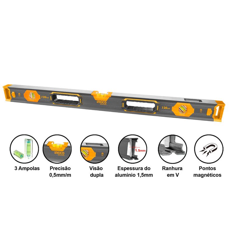 O Nível Magnético de Alumínio Industrial Ingco de 48" (1200mm) é uma ferramenta de alto desempenho, ideal para profissionais que exigem precisão em projetos de grande escala. Com estrutura robusta em alumínio, oferece resistência, durabilidade e leveza, além de ser projetado com dupla face fresada para medições exatas. Equipado com três ampolas, garante alta precisão no nivelamento. Com comprimento de 120cm e espessura de 1,5mm, é perfeito para trabalhos maiores e mais exigentes. Conta também com super imãs para fixação segura em superfícies metálicas e ranhura em V, facilitando o uso em superfícies arredondadas. Comercialmente denominado "Nível Magnético de Alumínio Industrial 48" / 1200mm", é a escolha ideal para quem busca qualidade e eficiência em seus projetos.
