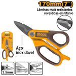 A Tesoura de Eletricista INGCO 7” foi projetada para oferecer máxima precisão, durabilidade e versatilidade em instalações elétricas e trabalhos profissionais. Fabricada em aço inoxidável com revestimento de titânio, ela é até três vezes mais resistente que lâminas convencionais, garantindo longa vida útil mesmo em uso intenso.