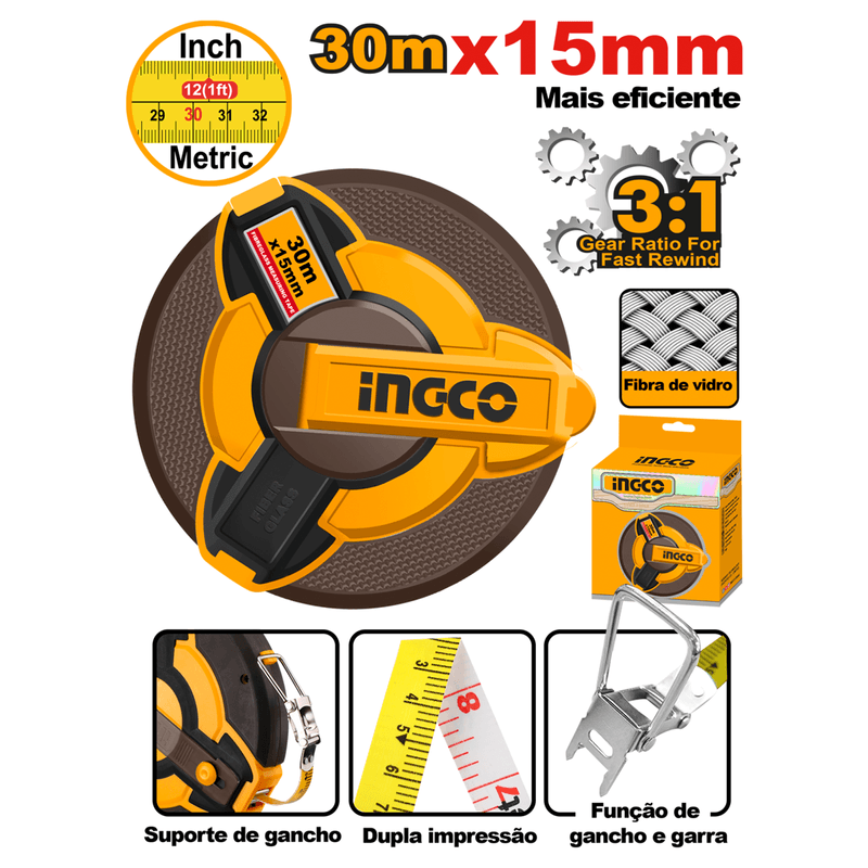 Trena de Fibra Longa INGCO com caixa fechada é ideal para medições extensas em obras, reformas, jardinagem, topografia e uso geral. A fita em fibra garante resistência e flexibilidade, enquanto a carcaça fechada protege contra sujeira e desgaste.